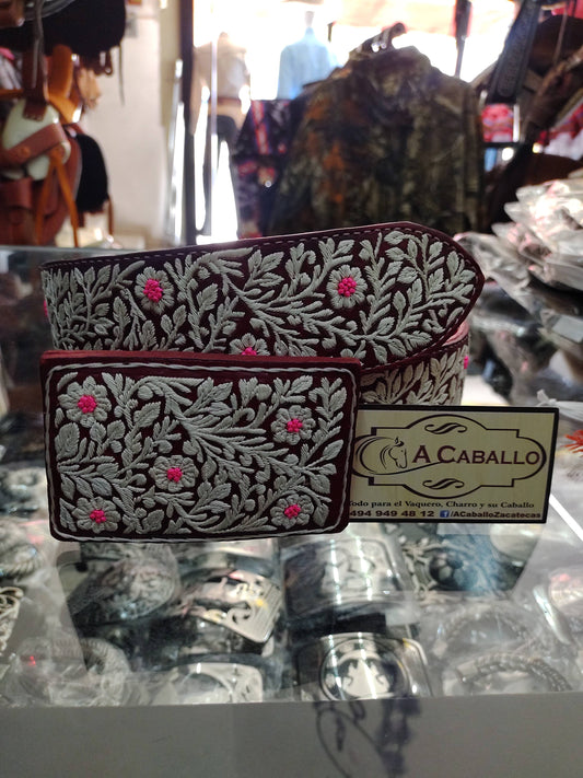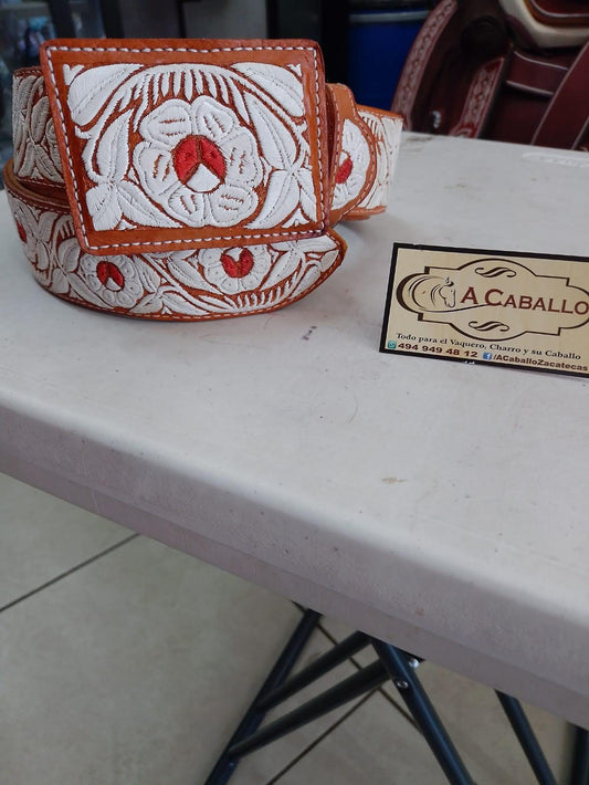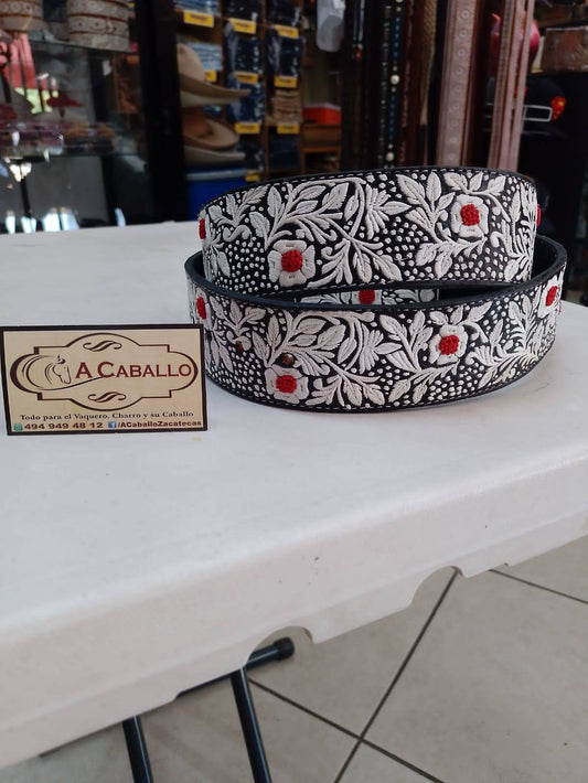Cinto Piteado Rosas Churros Rojos y Puntitos, Vaqueta color Negro