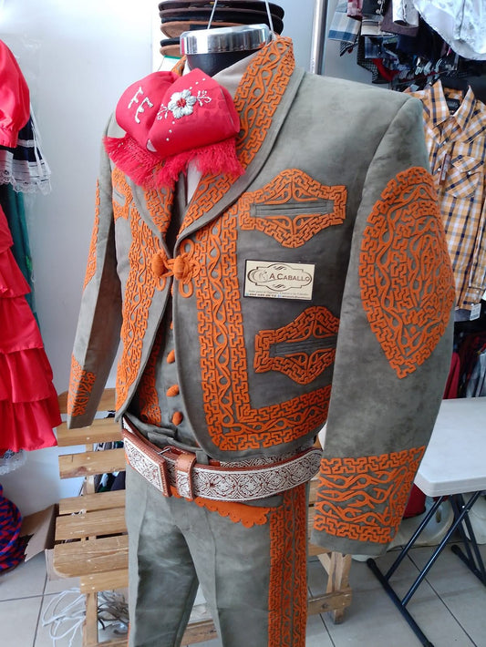 Traje Charro 3 Piezas en Gamuzina, con greca sencilla en Gamuza