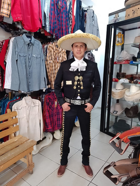 Traje Charro 3 Piezas, Chaleco y Chaquetilla bordado en hilo metalico, Botonadura en Oro, Media Gala.