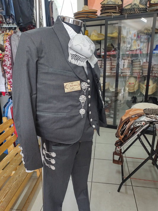 Traje Charro 3 Piezas, Media Gala en Baño de Plata, Bordado en hilo Metalico