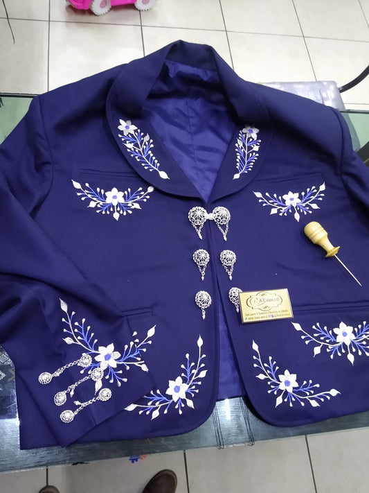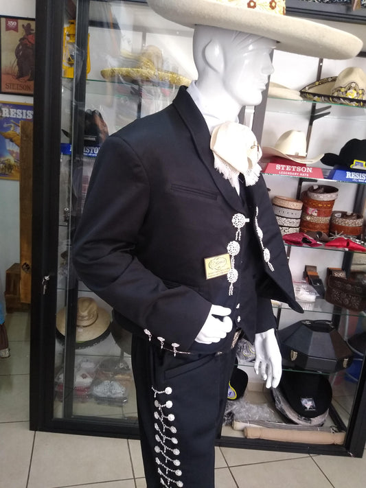 Traje Charro 3 Piezas, Pantalon, Chaleco y Chaquetilla, bordado en hilo metalico, Botonadura de Media Gala.